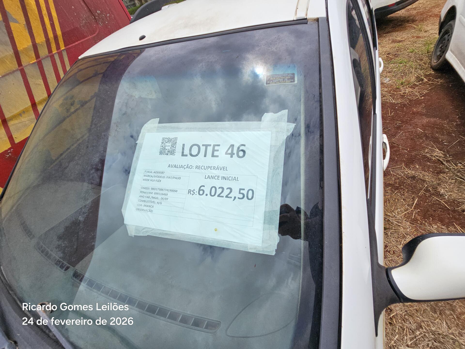 Lote 046 - Recuperável - AUTOMÓVEL - FIAT/PALIO WEEK HLX FLEX - PLACA:AOE6587 – CHASSI 9BD17306T74190050 – ANO 06/07 – COMBUSTÍVEL A/G – COR BRANCA – PROPRIETARIO SESP – RENAVAM 899116469