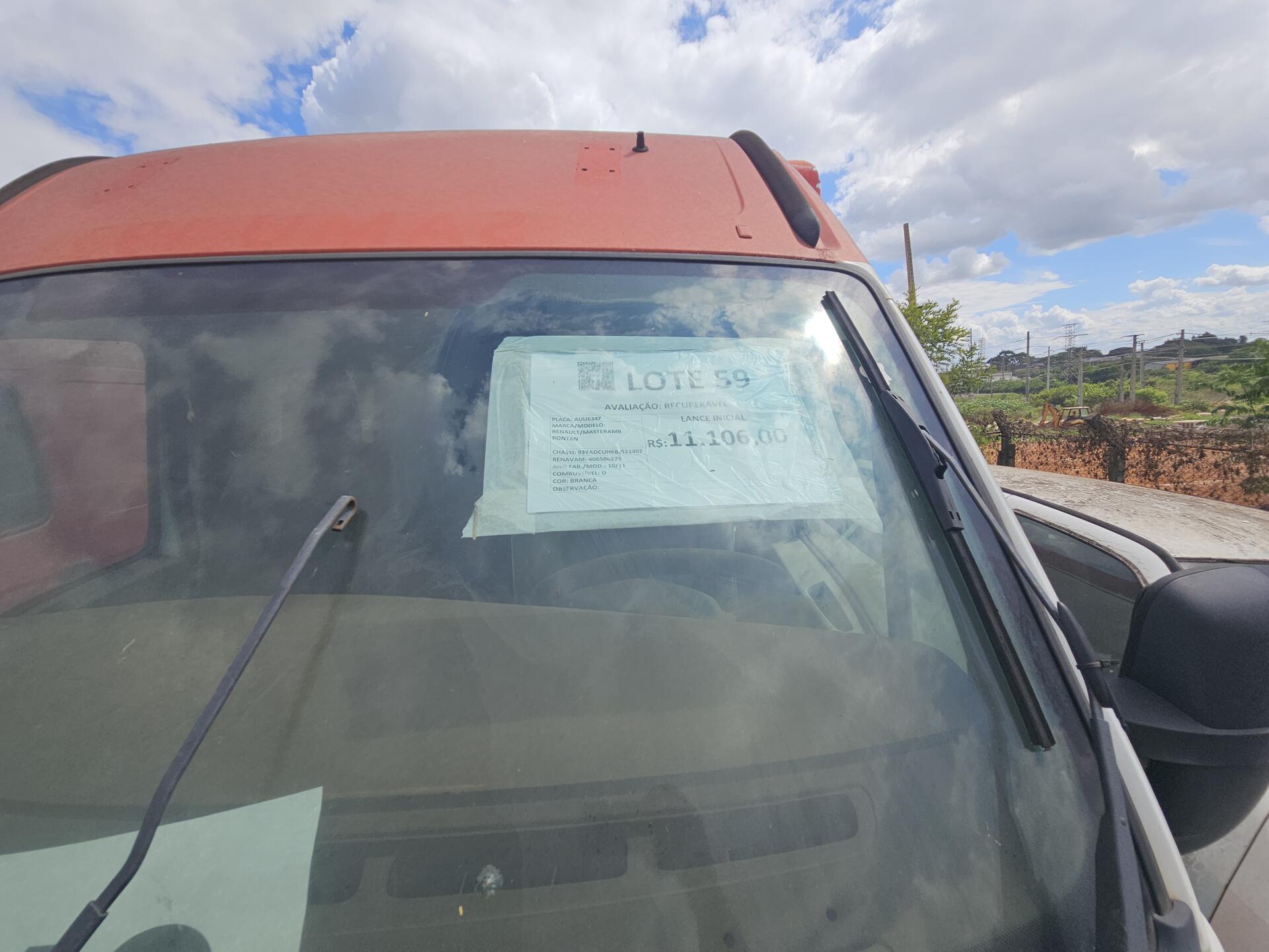 Lote 059 - Recuperável - CAMINHONETE - RENAULT/MASTERAMB RONTAN - PLACA:AUU6347 – CHASSI 93YADCUH6BJ521402 – ANO 10/11 – COMBUSTÍVEL D – COR BRANCA – PROPRIETARIO SESP – RENAVAM 406586225